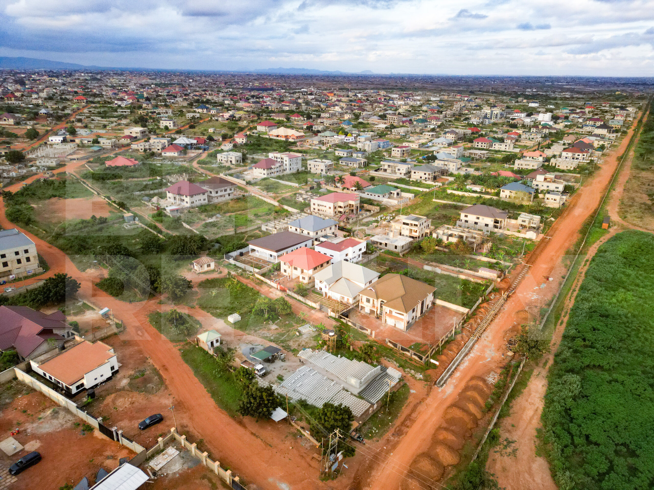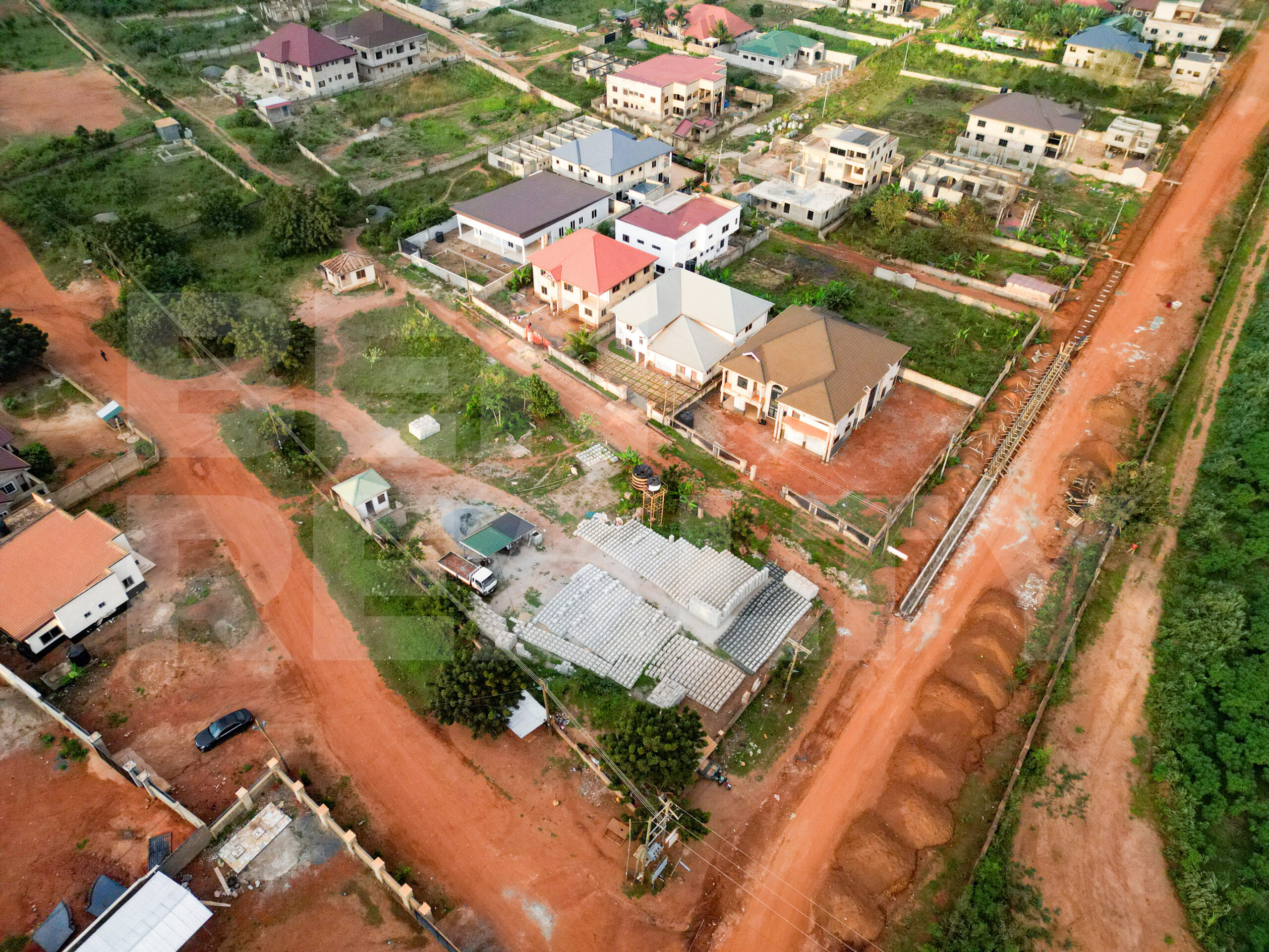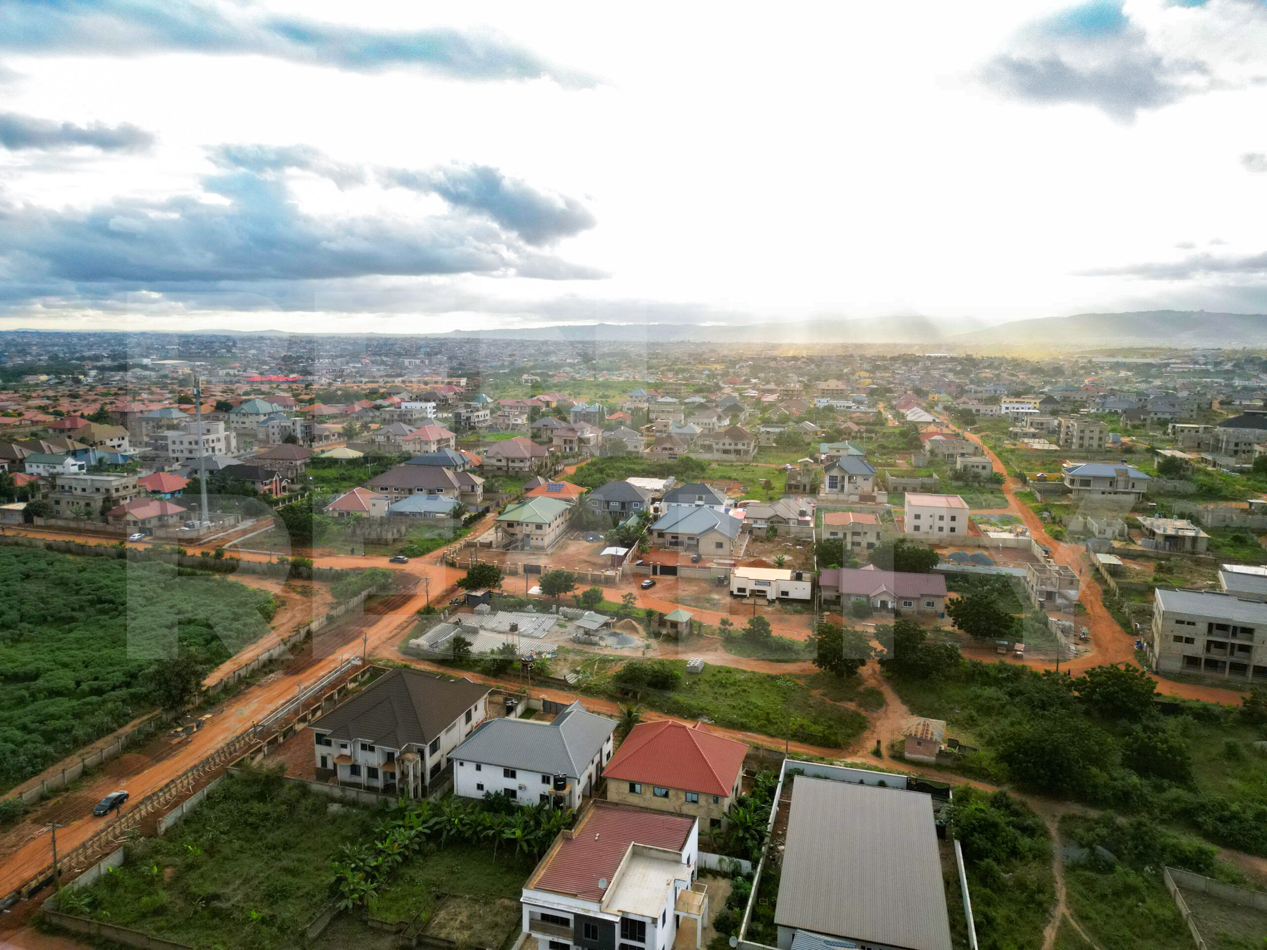 This titled 70×90 plot at Adenta – Amanfro is selling for GHC 450,000 and forms part of a planned mini estate. The area is well-structured with a road currently under construction and proper drainage systems already planned out. Conveniently located directly opposite a police station, the property offers added security, making it an excellent choice for residential or investment purposes in a safe and developing neighborhood.